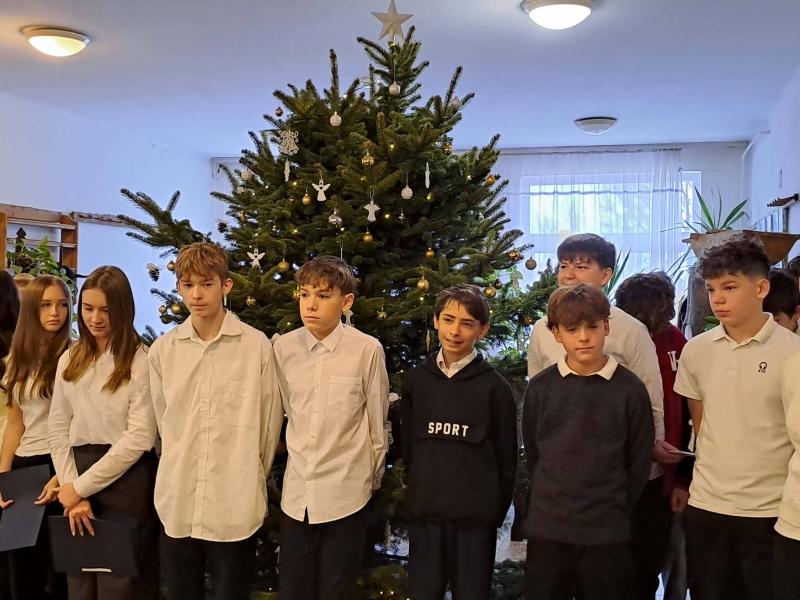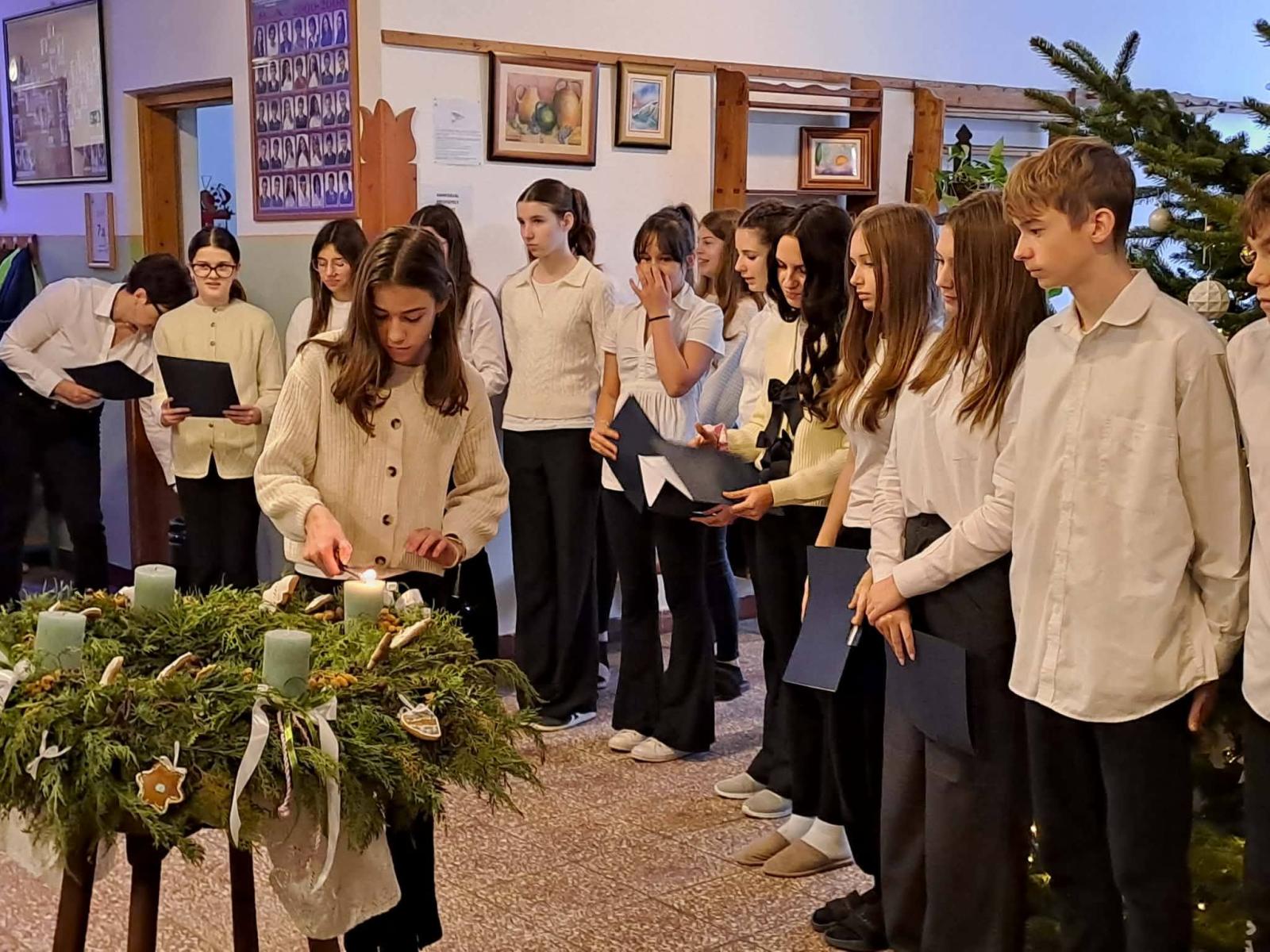 Az iskolában hétfőnként a nagyszünetben kerül sor a gyertyagyújtásra. Ezúttal a hetedik évfolyamosok rövid elmélkedéssel, versekkel készültek. Miután fellobbant az öröm gyertyájának lángja német, angol és magyar dalokat is hallhattunk az előadásukban. Jó volt ezzel a ráhangolódással kezdeni az utolsó tanítási hetünket.