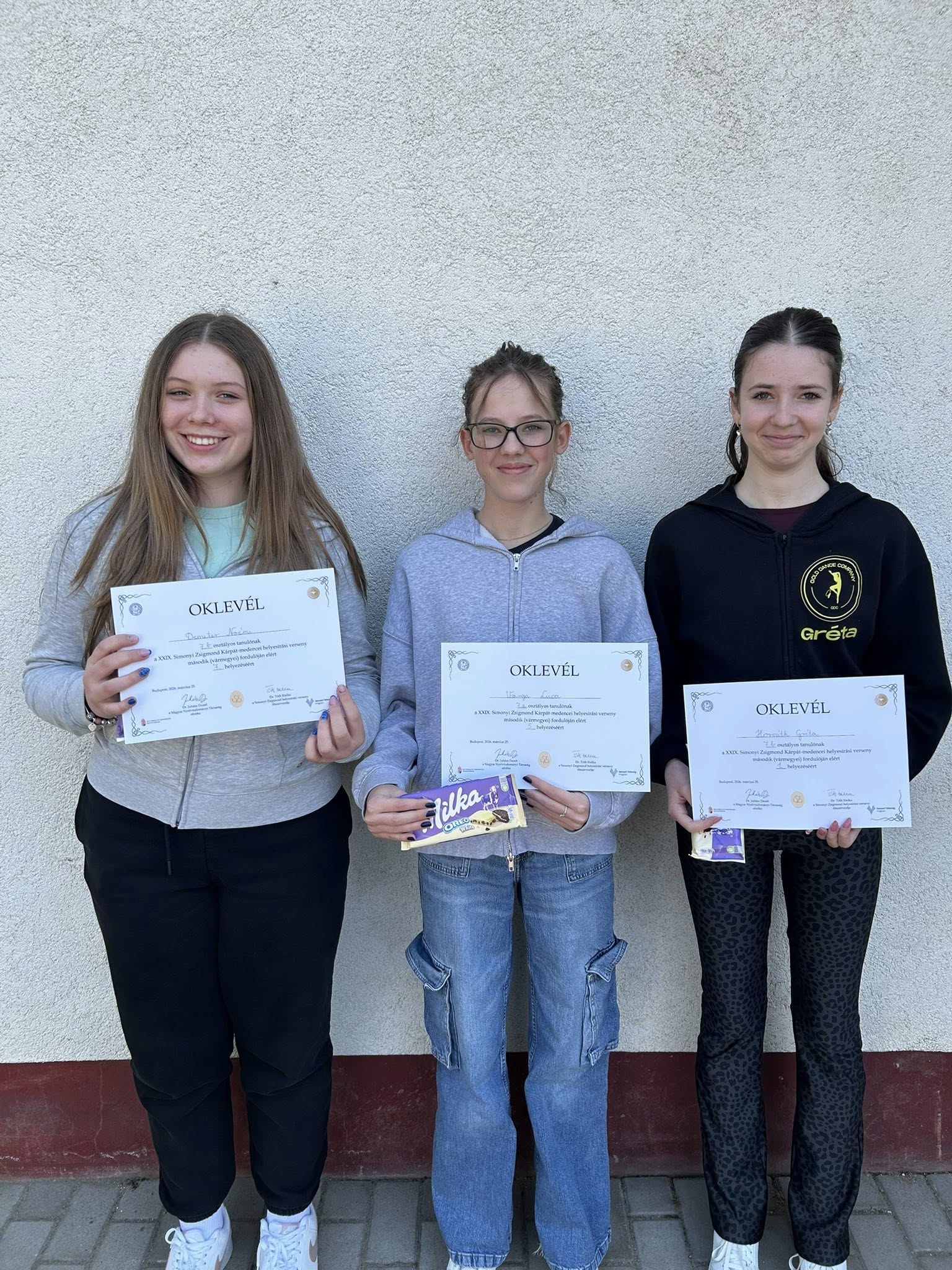 Legeredményesebb tanulóink a vármegyei versenyen: Horváth Gréta 7. b 1. helyezés, Varga Luca 7.a 5. helyezés, Demeter Noémi 7.b 7. helyezés. A többi versenyzőnket is dicséret illeti, hiszen többségük a mezőny első felében végezett.