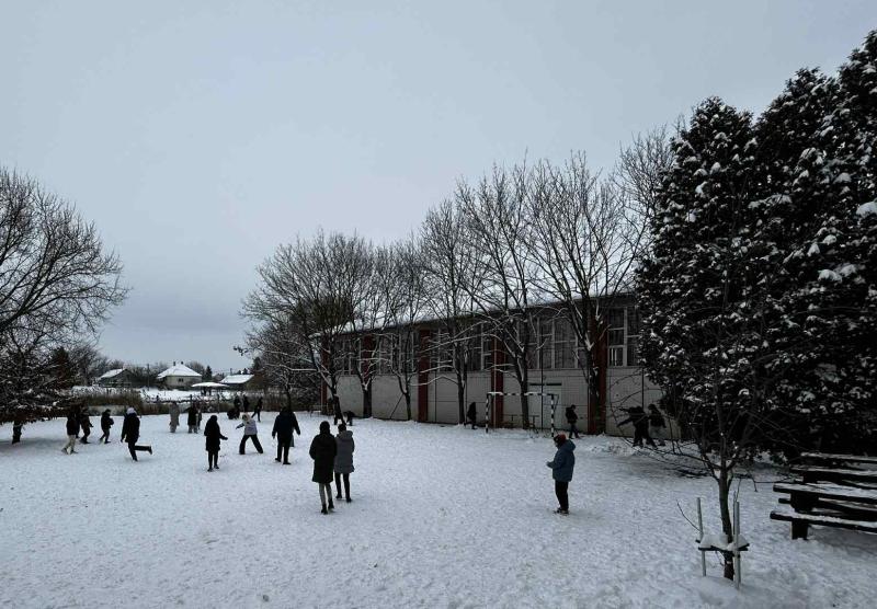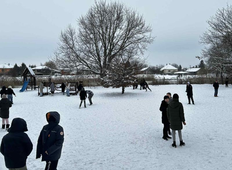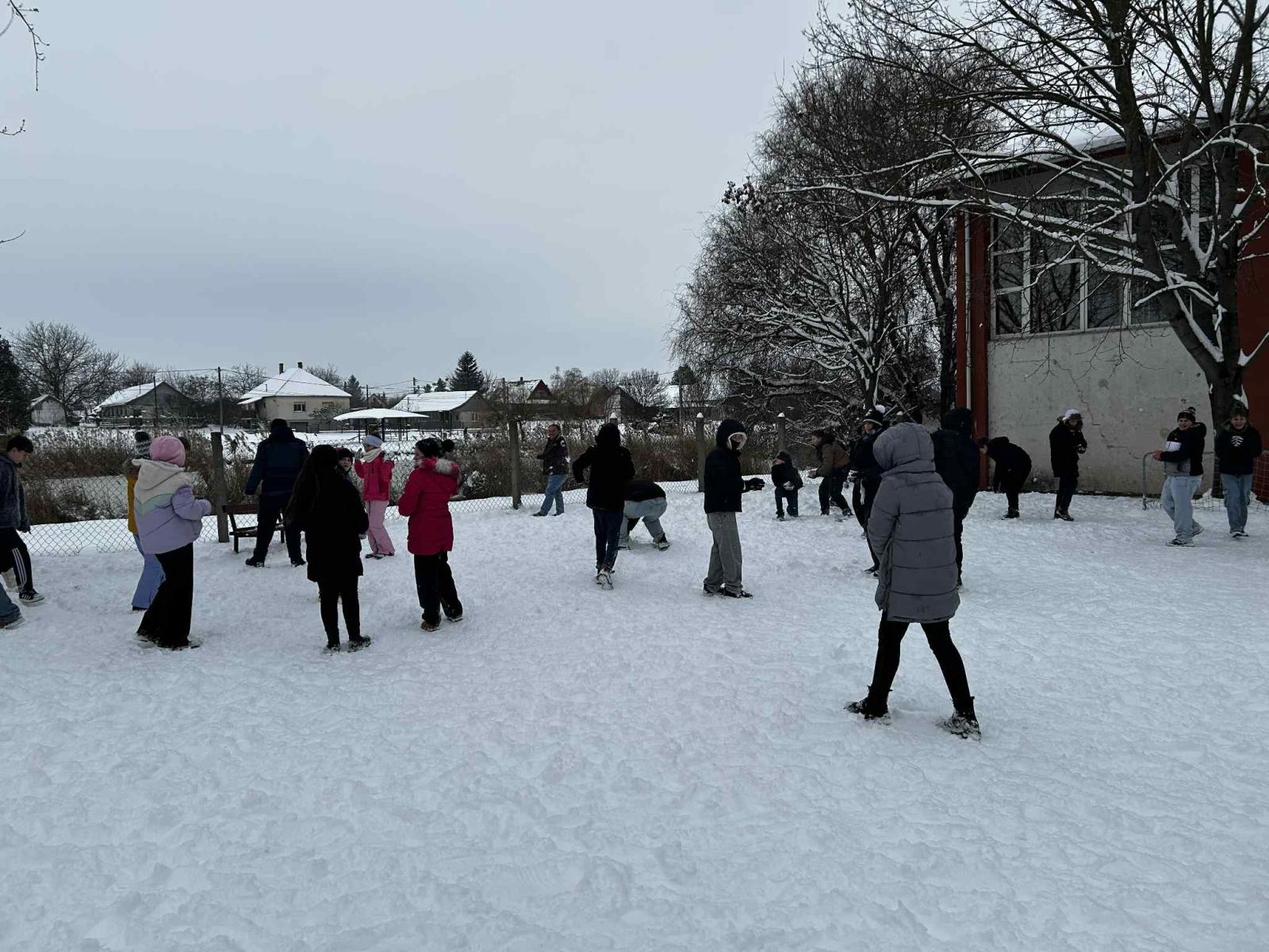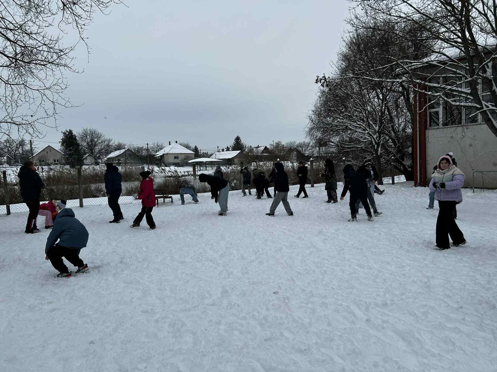 A héten igazi téli mesevilággá változott iskolánk udvara. A friss hó nemcsak gyönyörűvé varázsolta a tájat, hanem rengeteg örömet is szerzett a gyerekeknek. Az udvar a diákok nevetésétől volt hangos: hógolyócsaták bontakoztak ki, hóangyalok készültek, és mindenki önfeledten élvezte a tél adta lehetőségeket. Az egyik alkalommal még igazgató úr is beszállt a hógolyócsatába – a gyerekek eleinte kissé félénken, majd egyre bátrabban vették célba. Ezek az együtt átélt, felszabadult percek teszik igazán különlegessé az iskolai mindennapokat.