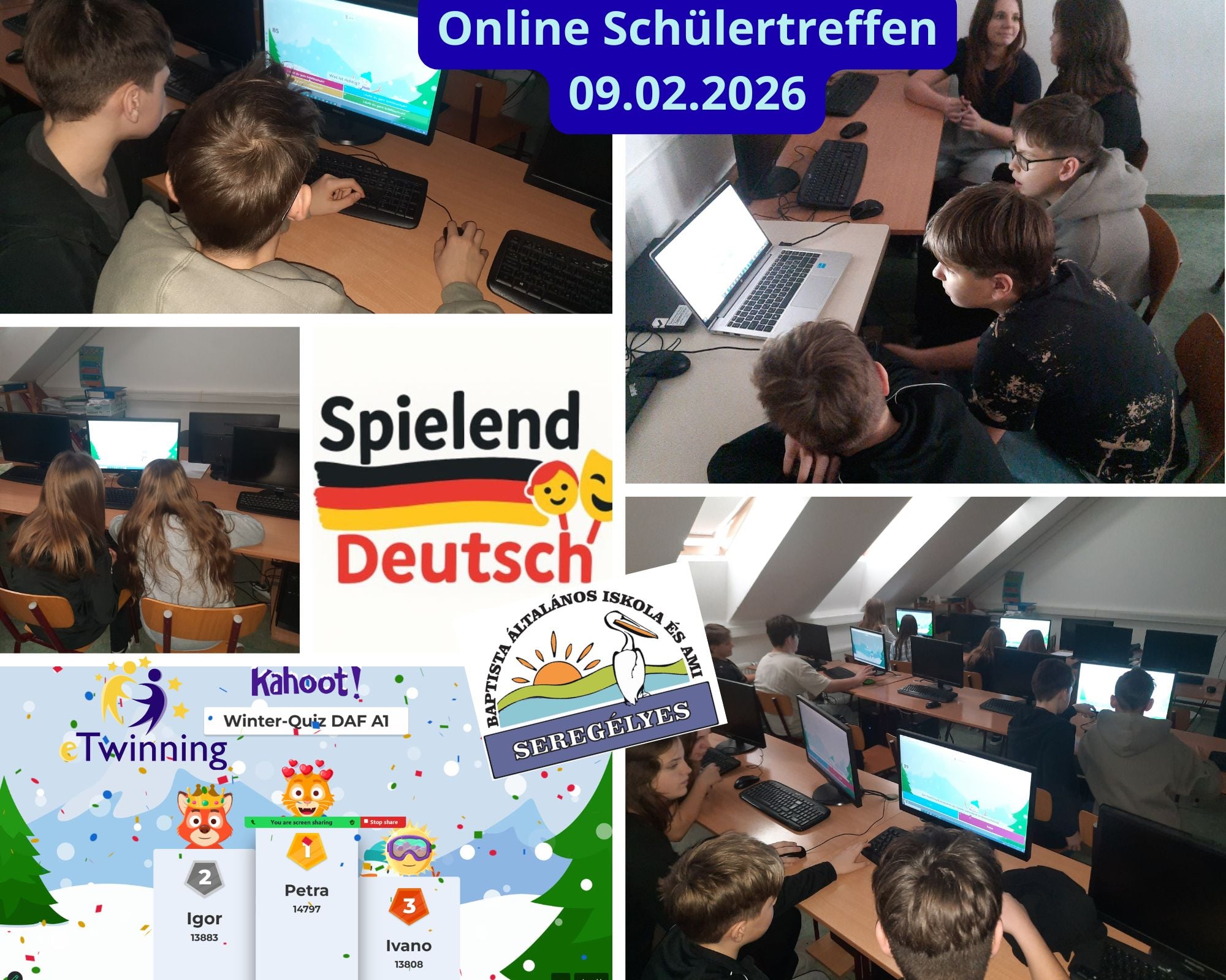 Február 9-én rendhagyó németórára került sor a hatodik évfolyamon. Az E-Twinning európai együttműködési program keretein belül online tanulói találkozót tartottunk horvát és lengyel partnereinkkel. A foglalkozás első felében online felületen mutatkoztak be egymásnak tanulóink, majd egy kvízsorral mérték össze tudásukat a tél témakörében idegen nyelven.