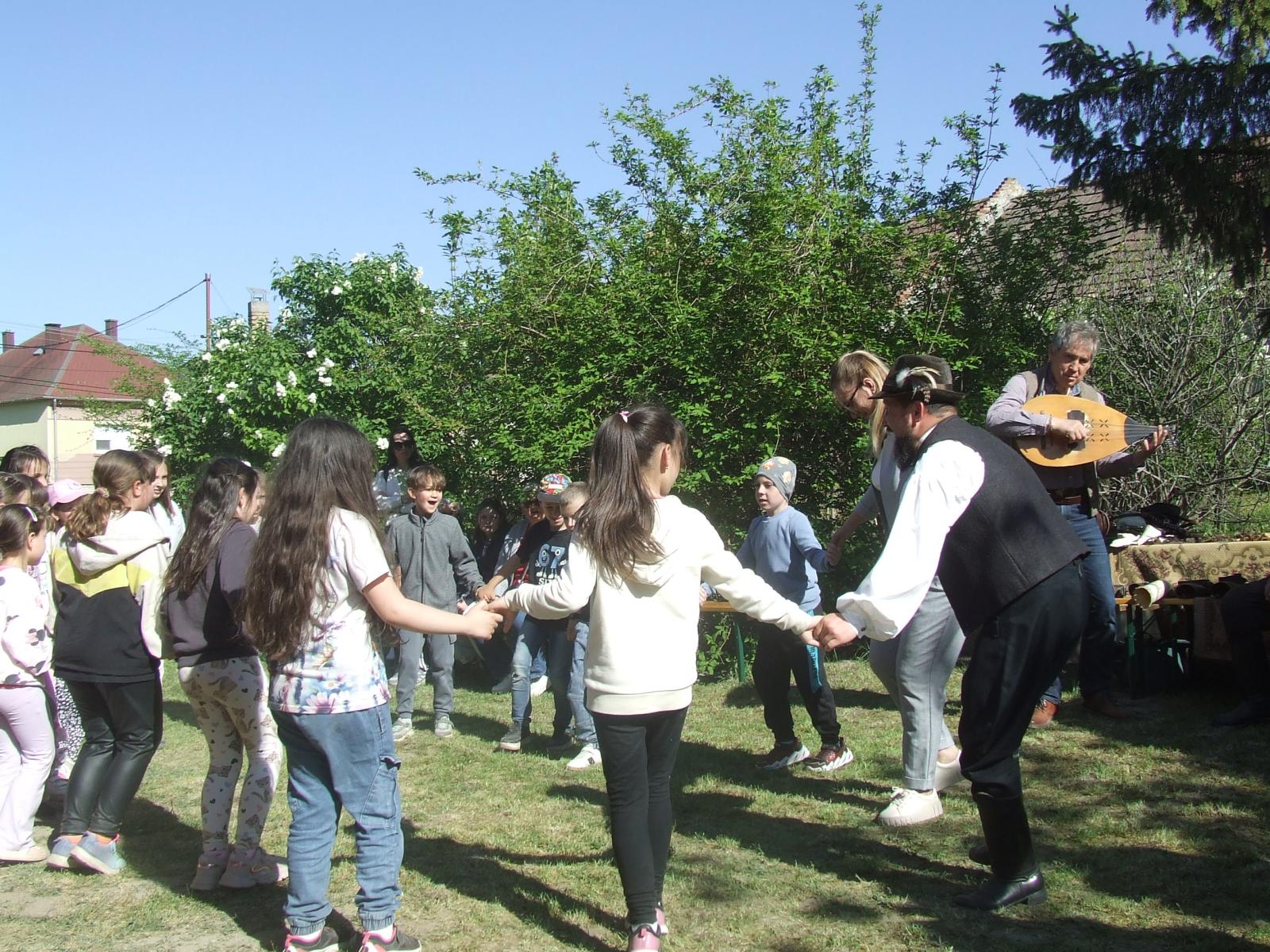 Az „emlékmuskátlik” elhelyezése után Nagy Imola és tanítványai énekeltek, citeráztak. A zsíroskenyerek és a tea elfogyasztása után következett a táncház. A Kákics zenekar (és furulyás diákjiank!) húzta a talp alá valót, Lippert Ferenc, Ferkó bácsi pedig játékos és vidám módon ismertette meg a legkisebbeket a gyerekjátékok és a tánc örömeivel. A nap zárásaként Buzáné Jutka néni, a Tájház mindenese és Hollósi Gábor, Pista bácsi fia ültette el Jókai almafáját. A fát, Petőfi körtefájához hasonlóan, Kovács Gyula pórszombati erdész és a Kossuth- és Jászai Mari-díjas Szarvas József színművész jóvoltából kapta meg iskolánk. Úgy gondoltuk, e jeles fa legjobb helyen a Tájház udvarán lehet.