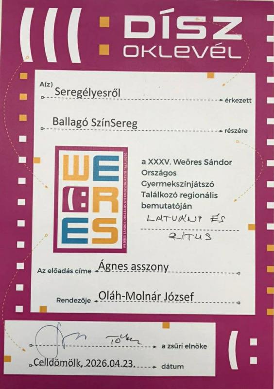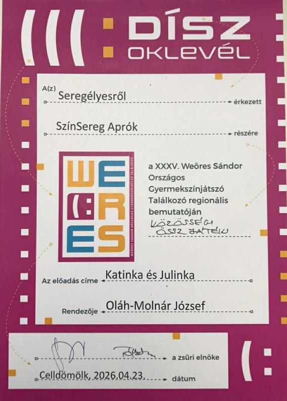 Április 23-án Celldömölkön rendezték meg a Weöres Sándor Gyermekszínjátszó Találkozó regionális fordulóját, ahol 12 csoport lépett színpadra. Mindannyian arany minősítésűek. Iskolánkat két produkció képviselhette: a legfiatalabbak és a legidősebbek csoportja. Velük tartott a harmadik, szintén arany minősítésű csapatunk is, jutalomként az eddigi munkájukért.