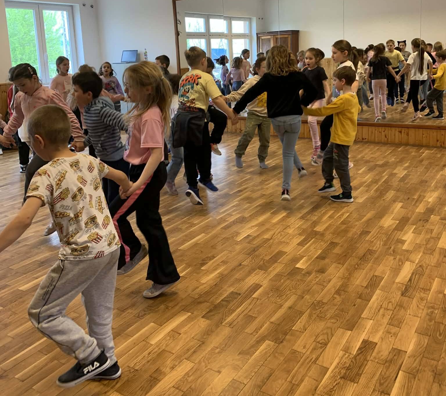 Az ovisok megilletődöttsége nem sokáig tartott. János bácsi pillanatok alatt oldott hangulatot varázsolt a népdalok éneklésével, ritmusok tapsolásával. A kicsik ámulva nézték a már kész táncos produkciókat. Még arra is jutott időnk, hogy az ovisokkal együtt táncoljunk. Nagyon sokan voltunk- közel százan a táncteremben. Ám mindenki talált egy talpalatnyi helyet a tánchoz. Vidám délutánunk volt! Angelika, Emília és Ildikó néni együtt táncolt a leendő kis elsőseivel. Köszönet Marton János tanár úrnak a szervezésért, s az emlékezetes tanodai foglalkozás levezényléséért.