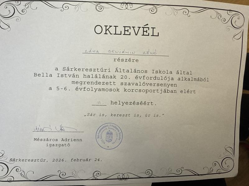 Gratulálunk Záha Benjámin Zénó 6.b osztályos tanulónak, aki a Sárkeresztúri Általános Iskola által, Bella István halálának 20. évfordulója alkalmából megrendezett szavalóversenyen a 5–6. évfolyamosok korcsoportjában II. helyezést ért el! Szívből gratulálunk a szép eredményhez, és további sikereket kívánunk!